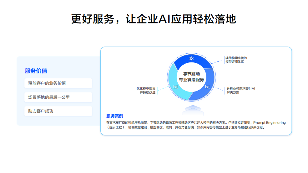 提供专业算法服务、prompt 优解工具、企业级模板及灵活 SDK,辅助构建评测体系、优化模型效果,打通场景落地 “最后一公里”,如某汽车厂商场景的效果优化